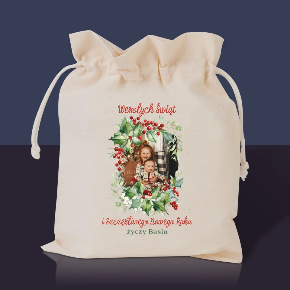 Woreczek typu sakiewka wykonany jest ze 100% bawełny i ma wymiary 20 x 25 cm.