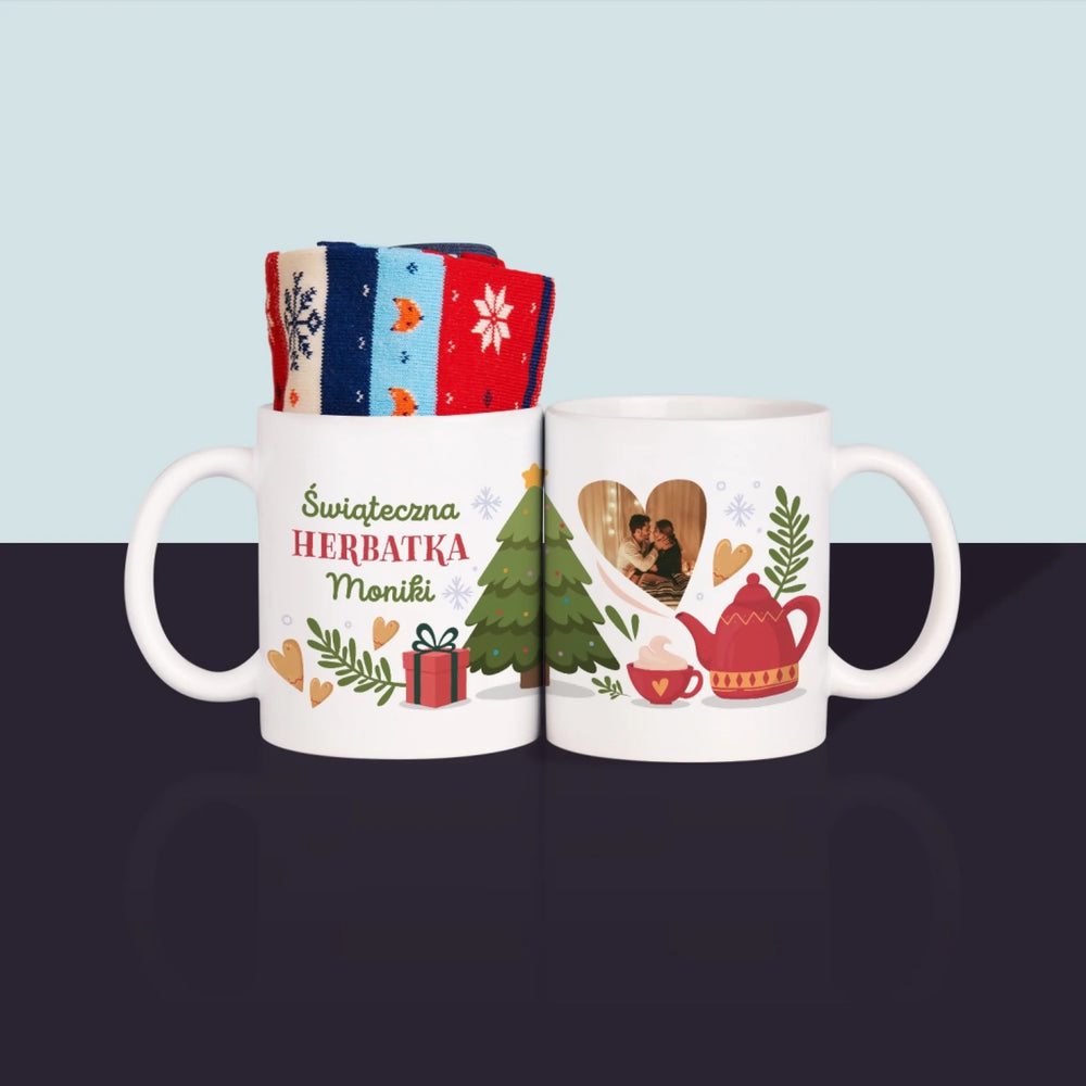 Wysokiej jakości kubek z wybraną przez Ciebie personalizacją ze skarpetkami w środku.