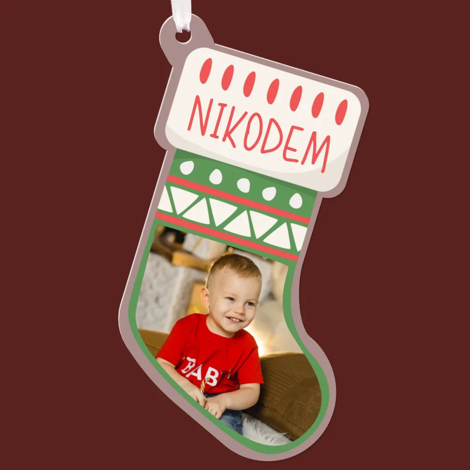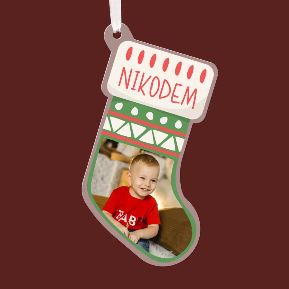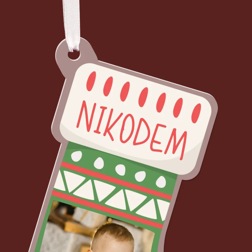 Zdjęcie i Podpis: Świąteczna Skarpeta - Bombka akrylowa skarpeta