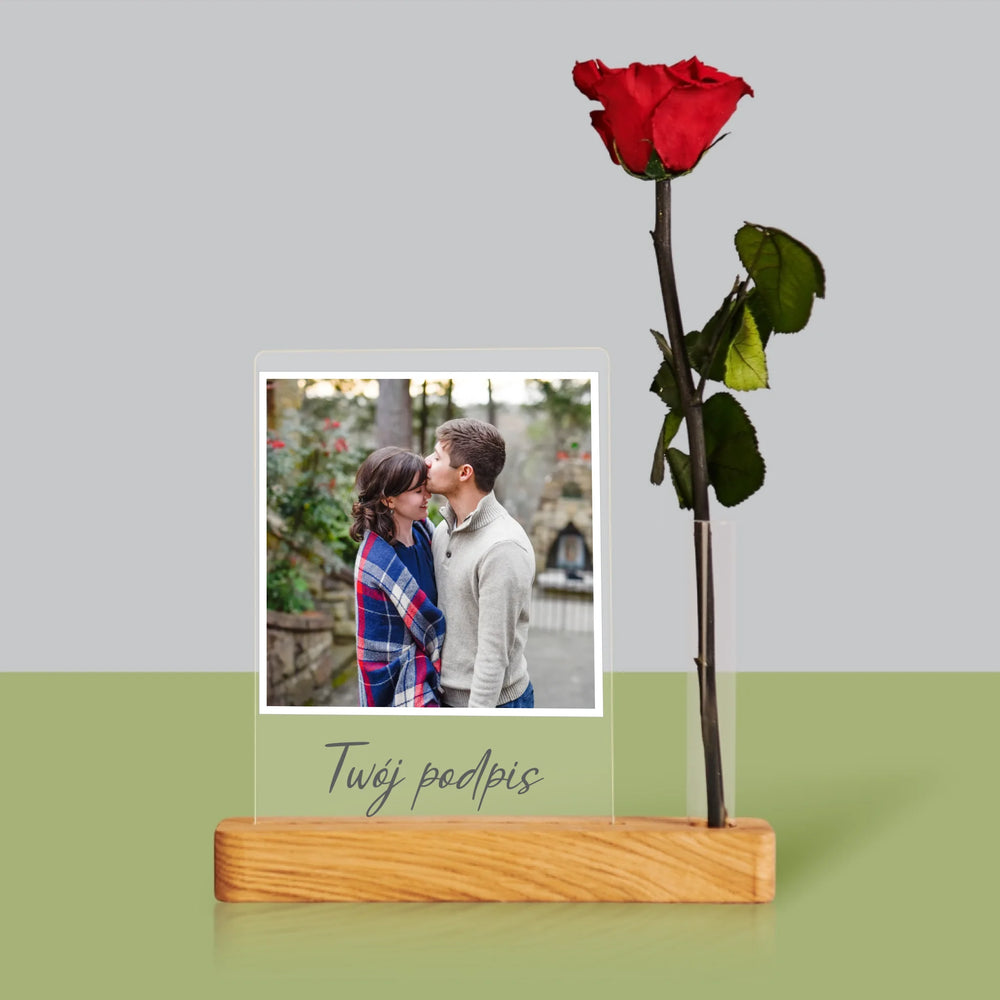 Dołączona róża w małym wazonie w kształcie probówki, umieszczonym w podstawce razem z wydrukiem na szkle akrylowym.