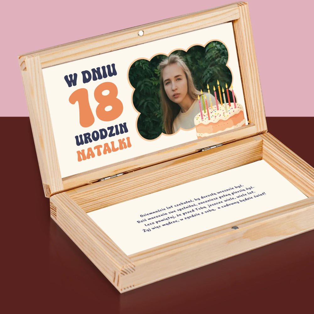 Zdjęcie i Podpis: w Dniu 18 Urodzin - Drewniane pudełko na pieniądze