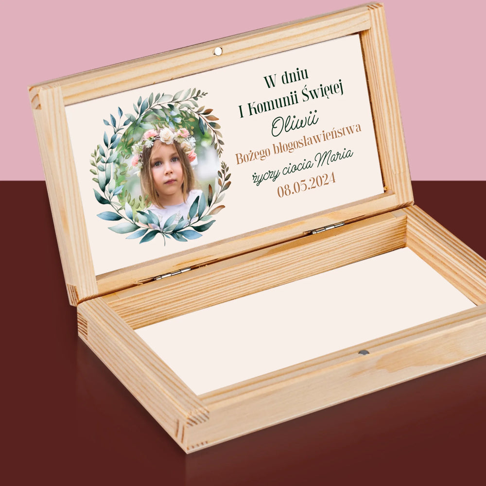 Zdjęcie i Podpis: w Dniu i Komunii Świętej - Drewniane pudełko na pieniądze