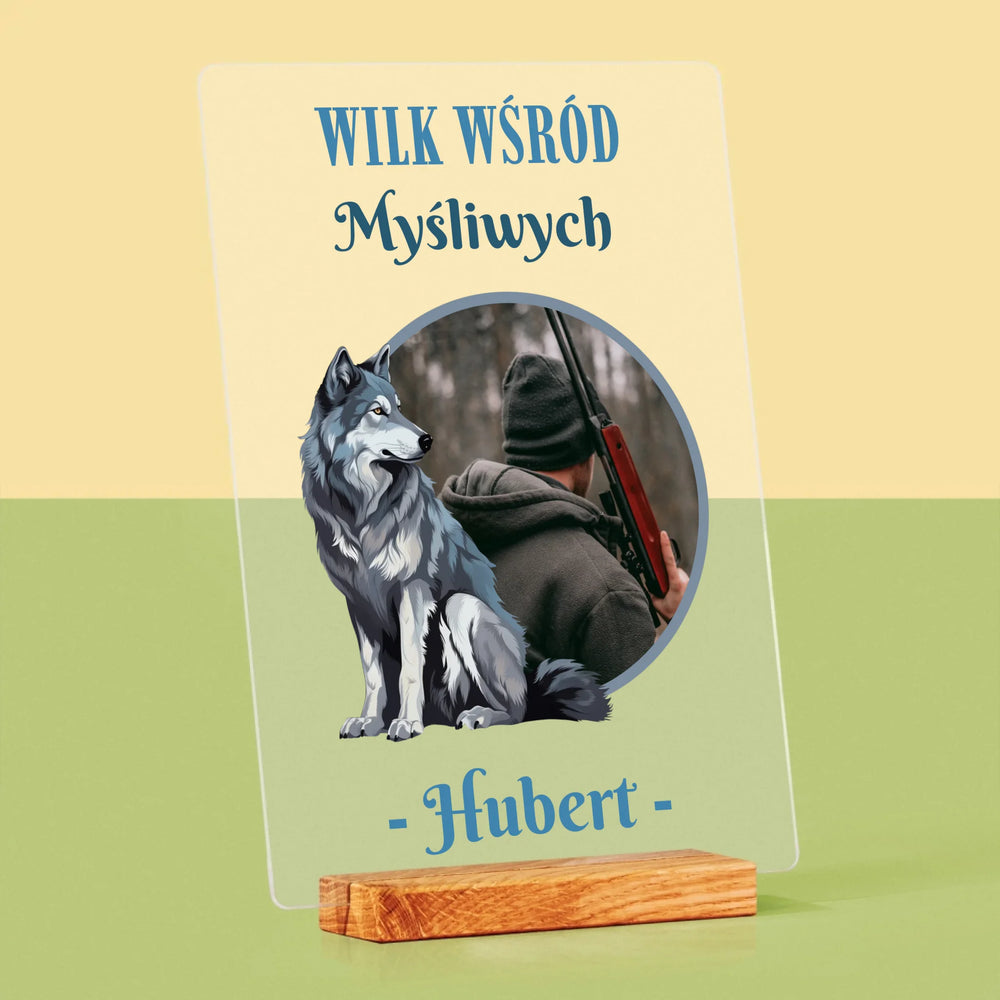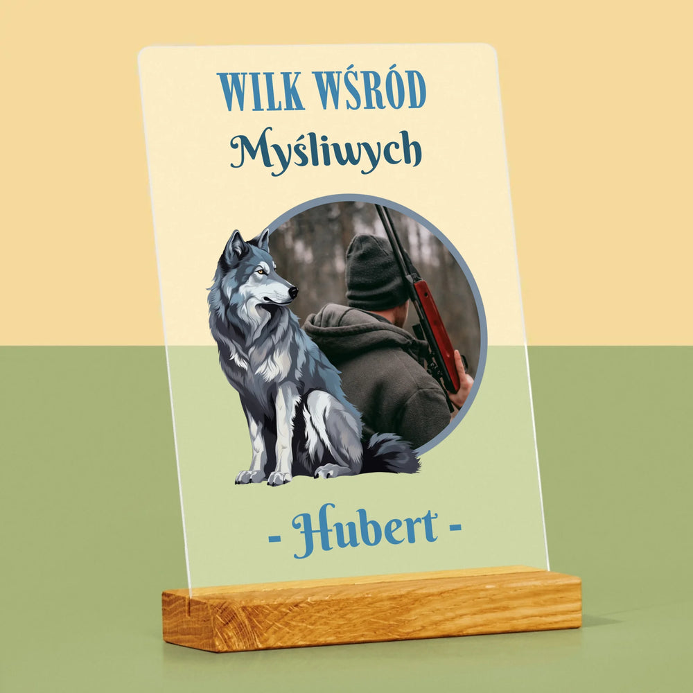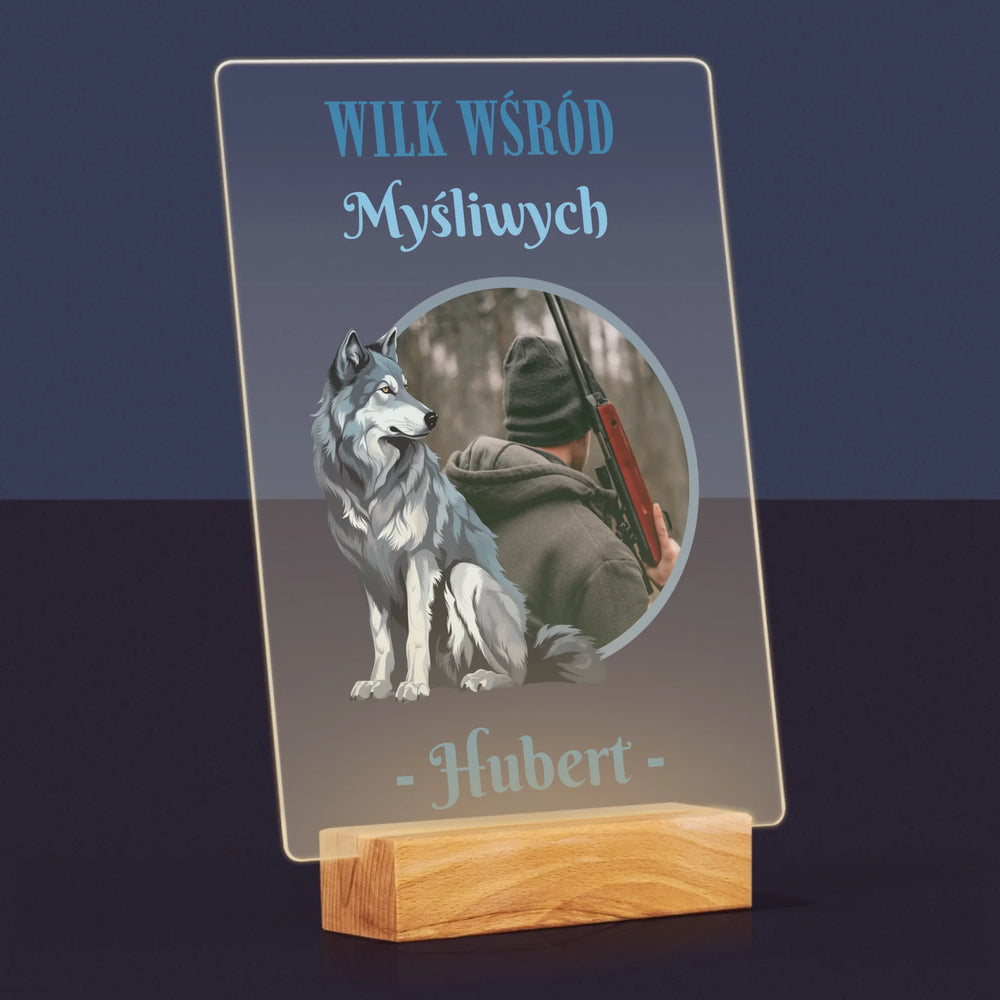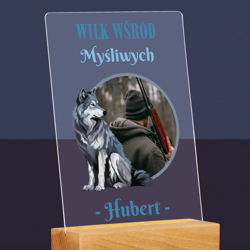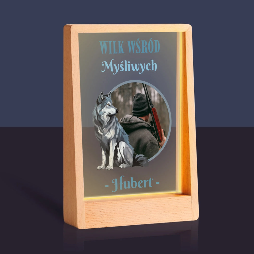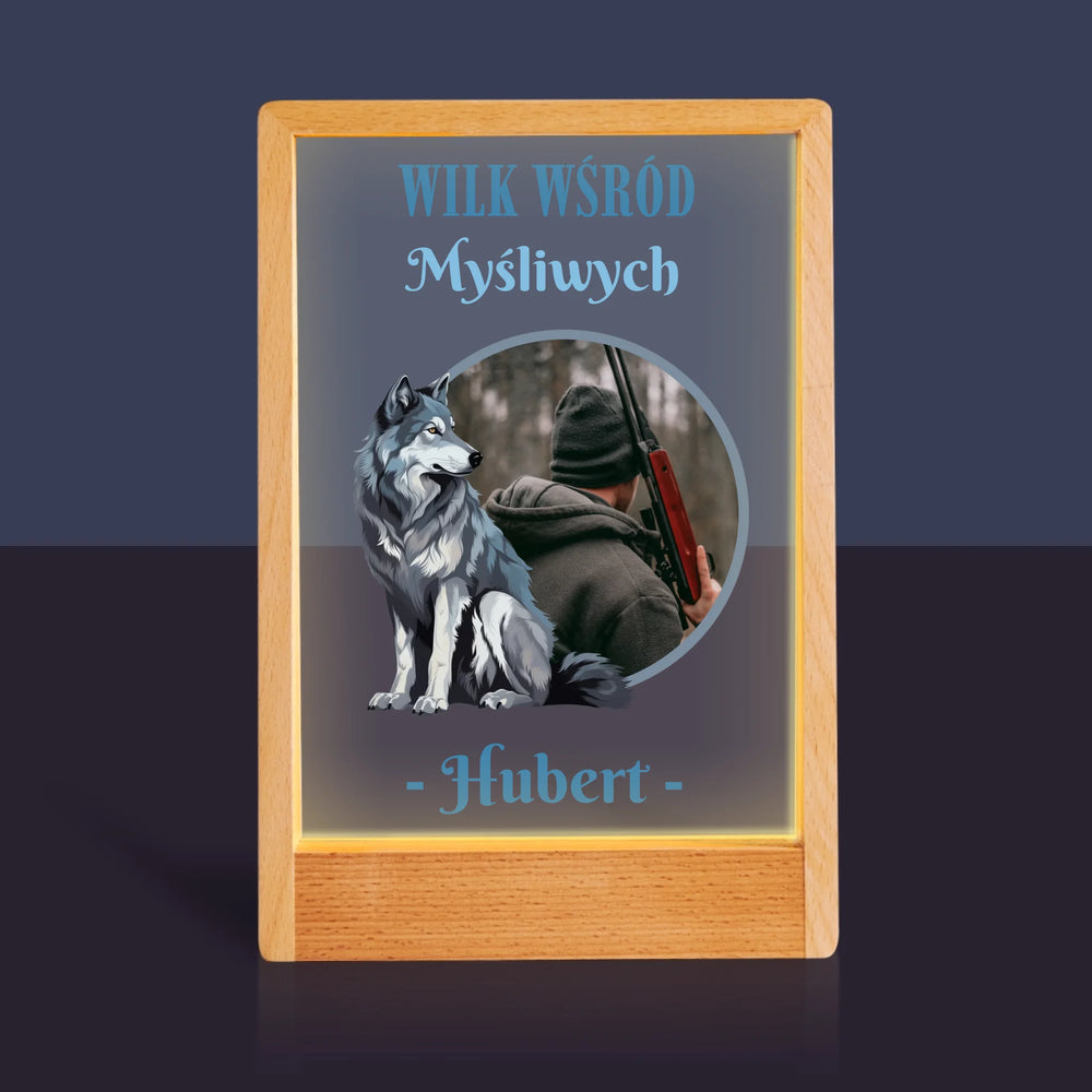 Zdjęcie I Podpis: Wilk Wśród Myśliwych - Wydruk na szkle akrylowym w ramce LED