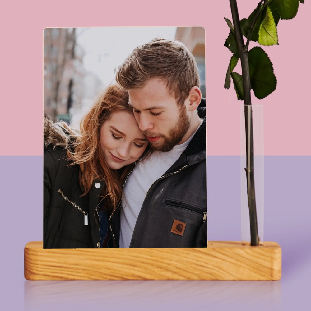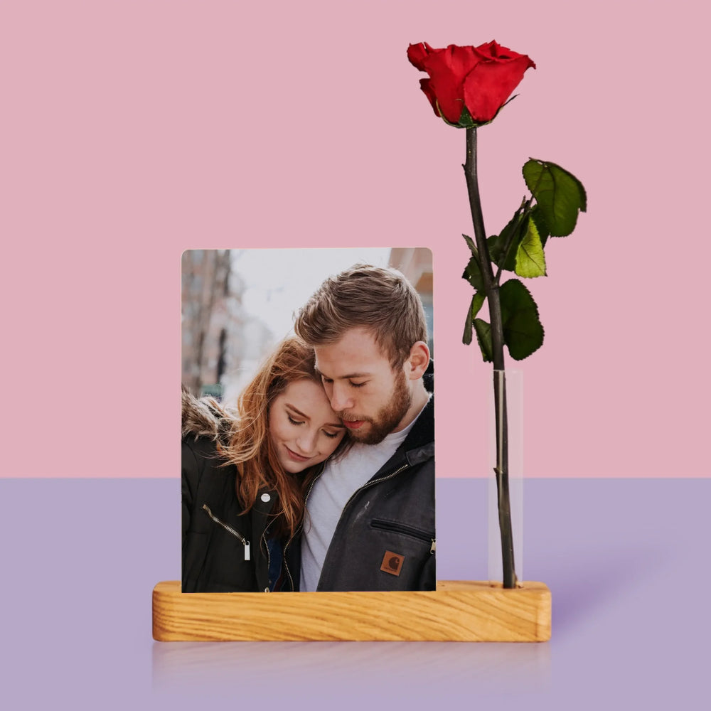 Dołączona róża w małym wazonie w kształcie probówki, umieszczonym w podstawce razem z wydrukiem na szkle akrylowym.